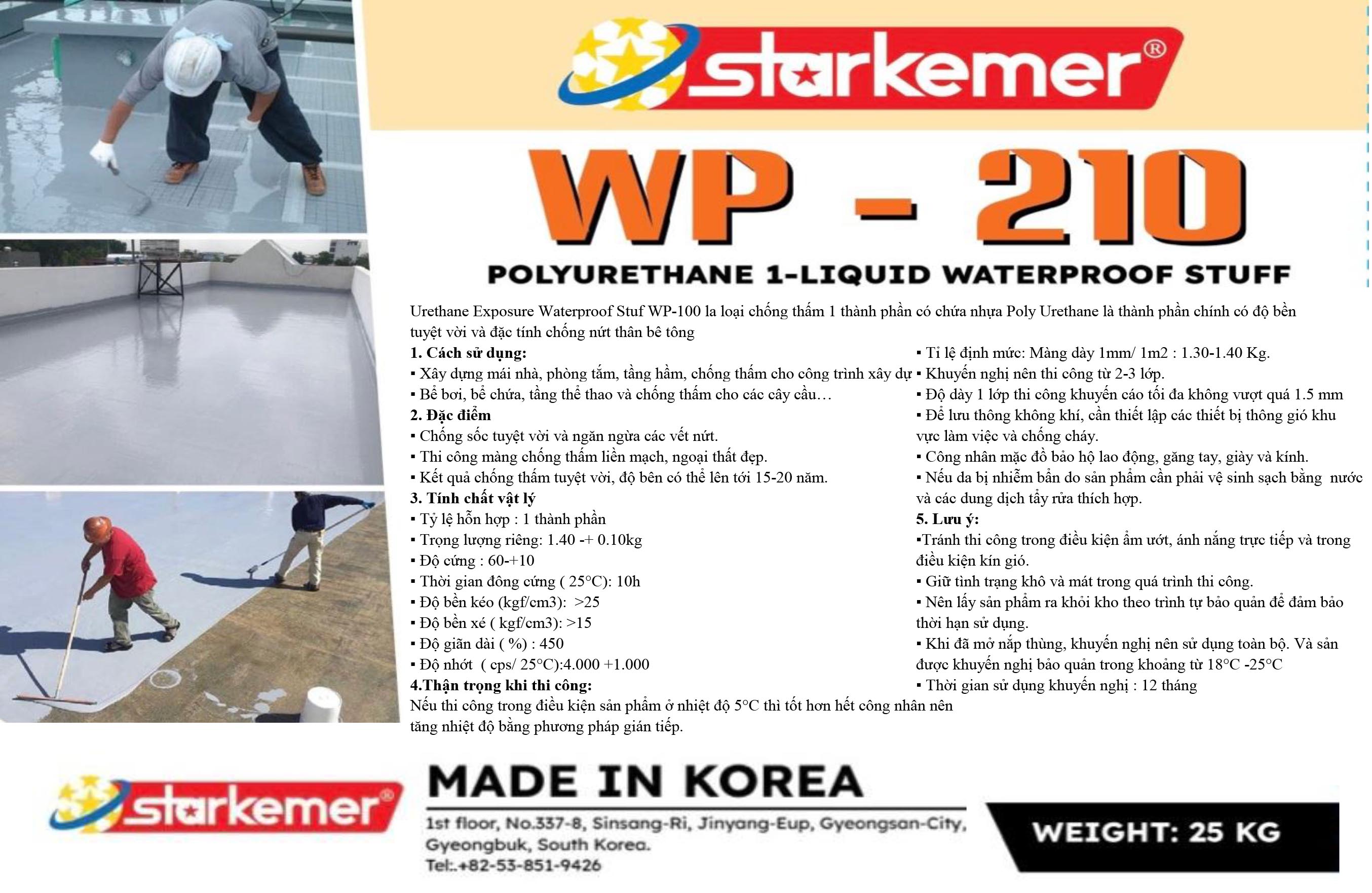 Sơn chống thấm Starkemer PU WP- 210 là loại chống thấm 1 thành phần có chứa nhựa Poly Urethane là thành phần chính có độ bền tuyệt vời và đặc tính chống nứt thân bê tông, được ứng dụng rất nhiều trong chống thấm dột sân thượng, chống thấm dột tường nhà, chống thấm khe tiếp giáp, chống thấm nhà wc, chống thấm sàn mái, chống thấm trần nhà...