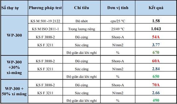 Như vậy, thông qua bảng báo cáo thì việc trộn với 50% xi măng vào hỗn hợp chống thấm WP-300 thì các thông sô về độ đàn hồi và sức căng màng chống thấm vẫn rất cao, ngoài ra việc này còn tăng cường độ cứng cho màng chống thấm.